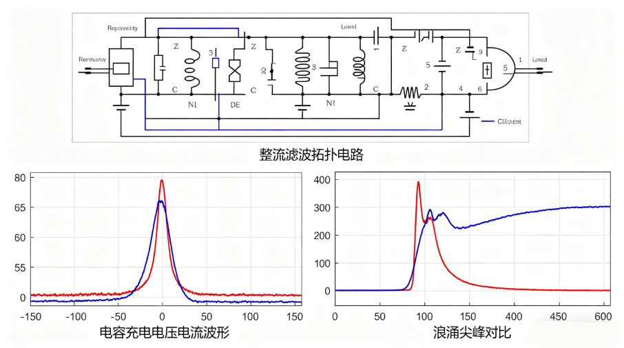 开关电源前级整流滤波拓扑电路图、电容上电充电电压电流示波器实测波形、浪涌尖峰对比示意图