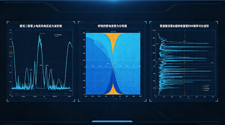 整流二极管上电反向电压应力波形图、桥堆四管电流受力分布图、普通整流管&超快恢复管EMI噪声对比波形