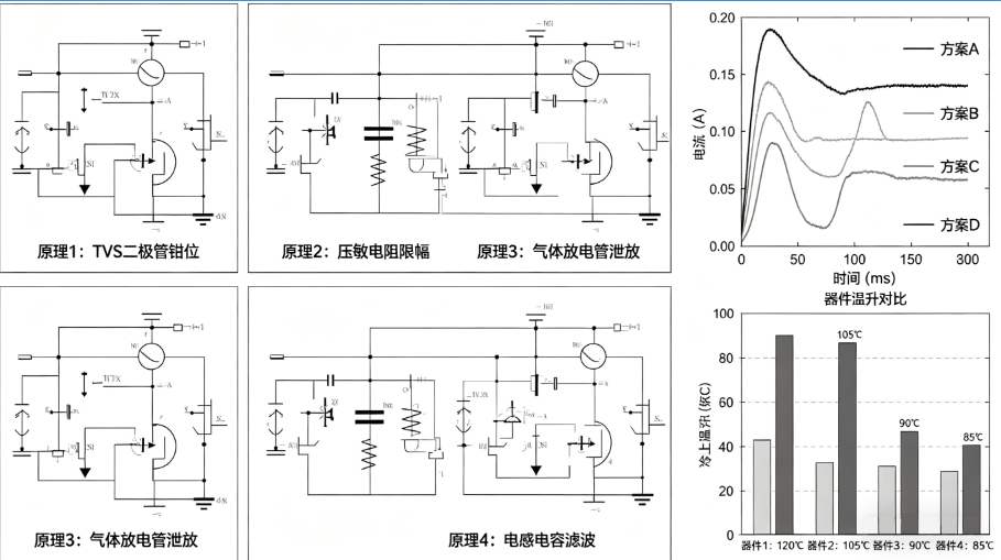 四种浪涌抑制原理电路图、冷上电电流波形对比图、器件温升对比效果图
